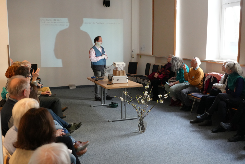 Harald Hellstern von pax christi und der Rüstungsexportkampagne leitete ein interaktives Planspiel, das die komplexen Dynamiken von Rüstungsexporten erfahrbar machte. Die Teilnehmenden schlüpften in die Rollen verschiedener Akteur:innen – von der Friedensbewegung über Rüstungsproduzenten bis hin zur Regierung– und diskutierten die Positionen in einem fiktiven Entscheidungsprozess. Am Ende des Spiels sprachen sich alle Gruppen gegen den Rüstungsexport aus – ein Ergebnis, das angesichts des Rahmens einer Friedenskonferenz vielleicht wenig überraschend war, aber dennoch die Macht der Perspektivübernahme unterstrich. Das vollständige Planspielmaterial steht hier zum Download bereit.