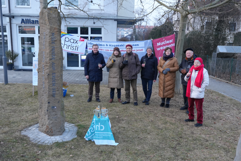 Wir in Gilching haben darauf angestoßen mit Bürgermeister und Bürgermeisterkandidatin an unserem Friedenspfahl, den wir vor über 20 Jahren aufgestellt haben. In der Hoffnung dass zu den heute 95 Staaten, die den AVV unterzeichnet, - davon haben ihn auch schon 74 ratifiziert - noch viele weitere dazu kommen.